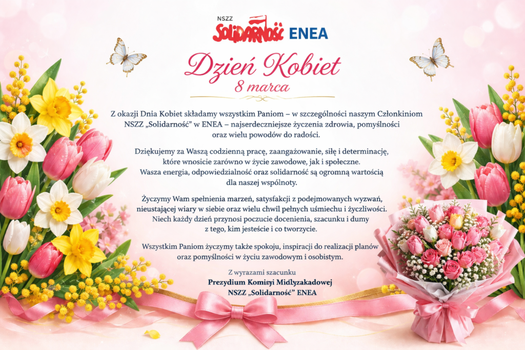 Z okazji Dnia Kobiet składamy wszystkim Paniom – w szczególności naszym Członkiniom NSZZ „Solidarność” w ENEA – najserdeczniejsze życzenia zdrowia, pomyślności oraz wielu powodów do radości.